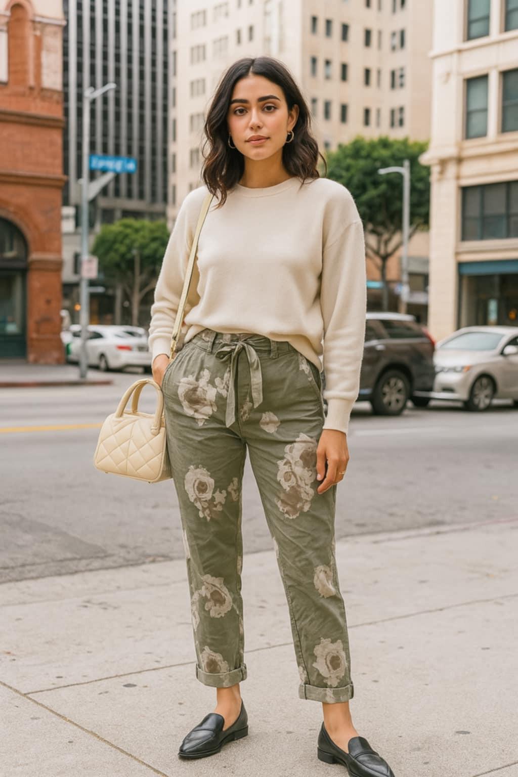 Key Features: Olive green base with taupe floral print Lightweight, breathable fabric with slight stretch Adjustable tie-waist for a custom fit Tapered legs with rolled cuffs Side pockets for convenience Casual yet stylish urban vibe