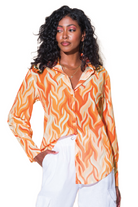 Elevate your wardrobe with this stunningly vibrant flame Pucci print shirt. Featuring a mesmerizing abstract pattern resembling flickering flames, the shirt comes in a bold color palette of orange and cream, making it a show-stopper for any occasion.