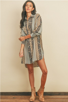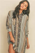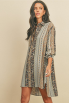 Paisley stripe print button down shirt dress featuring a front patch pocket and subtle high-low hem. Unlined. Model is 5'9" and wearing size Small.