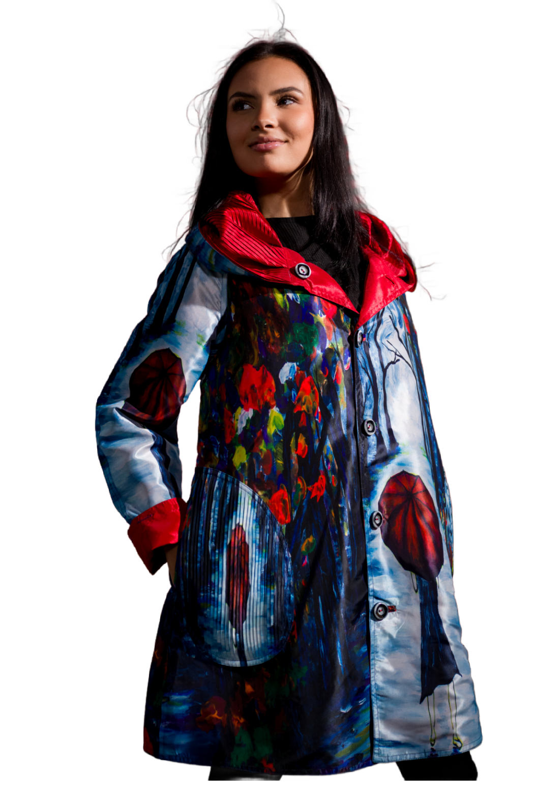 Make a statement with this art-inspired women's raincoat, featuring a stunning, painterly design that brings a unique and vibrant touch to any rainy day. Crafted with a water-resistant, lightweight fabric, this colorful coat ensures both style and practicality. The bold artistic print, depicting a serene rainy-day scene with vivid reds and deep blues, transforms outerwear into an expressive fashion piece. Designed for comfort and versatility, this coat includes a stylish oversized hood with a contrasting red lining, adjustable cuffs, and large functional pockets for added convenience. The button-down front closure provides ease of wear, while the flattering A-line silhouette allows for effortless layering over different outfits. Whether strolling through the city or exploring the outdoors, this raincoat is a perfect blend of fashion and function