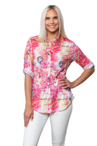 Discover the vibrancy and flair of this eye-catching women's blouse, perfect for adding a splash of color to any wardrobe. Boasting a bold, artistic print with an array of vibrant hues and charismatic text and graphic motifs, this top is sure to make a statement whether you're at work or enjoying a casual day out.