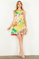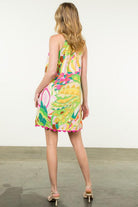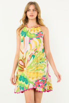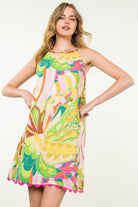 Brighten up your wardrobe with this vibrant sleeveless swing dress, featuring a bold and colorful abstract floral print. Designed for effortless elegance, this dress boasts a relaxed A-line silhouette that flatters all body types while ensuring all-day comfort. The high neckline is adorned with delicate braided trim, adding a touch of sophistication, while the scalloped hem with contrasting pink accents enhances its playful charm. Perfect for warm-weather outings, vacations, or casual gatherings, this lightweight dress moves beautifully with every step. Crafted from breathable fabric, it ensures a cool and breezy feel, making it an ideal choice for both daytime adventures and evening socials. Pair it with sandals for a relaxed look or dress it up with heels and accessories for a chic statement.