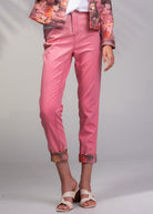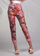 Alison Sheri will Help youMake a bold yet feminine statement with these reversible pink floral high-rise jeans, designed for effortless versatility and everyday glam. Featuring a vivid garden-inspired print on one side with rich hues of rose, coral, lavender, and olive, these jeans reverse to a solid rose pink for a sleek and polished alternative. The perfect fusion of artful flair and practical design, these dual-look denim pants allow you to switch up your style with a simple flip. Tailored in a modern slim-straight silhouette, these high-waisted reversible jeans offer a flattering fit with a hint of stretch for comfort. Finished with classic five-pocket styling and rolled cuffs that highlight the contrast inner fabric, they’re a must-have for the fashion-forward woman seeking statement versatility.