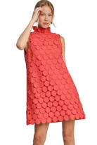 Introducing the chic Coral Sleeveless Dress, a standout piece perfect for any fashion-forward wardrobe. This stunning dress features a distinctive textured design with a series of circular patterns that add depth and interest to its silhouette. The high ruffled neckline elevates its elegance, making it an ideal choice for both casual and more formal occasions. Crafted from high-quality, breathable fabric, this dress ensures comfort while maintaining a polished look. Its vibrant coral hue is both eye-catching and stylish, suitable for any season. The sleeveless cut offers versatility, allowing you to pair it with a jacket or wear it alone. Key selling points: - Unique textured circular pattern - High ruffled neckline for added sophistication - Vibrant coral color - Versatile sleeveless design - Comfortable and breathable fabric This dress is a perfect blend of comfort and style, ideal for those who love to stand out with their fashion choices. Fully LIned!