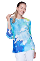 Elevate your wardrobe with this vibrant and artistic watercolor-print knit top. Designed for those who love to add a splash of color to their outfits, this top features a beautiful blend of soothing blues and refreshing greens, creating an abstract and cloud-like pattern reminiscent of a serene sky.