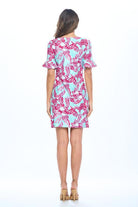 Elevate your wardrobe with this vibrant tropical print dress, perfect for sunny days and casual outings. The dress features a flattering V-neckline and charming ruffled sleeves, adding a touch of feminine elegance. Its lightweight fabric ensures comfort and breathability, making it ideal for warm weather. The playful pink and blue leaf pattern brings a burst of color to your look, allowing for versatile styling options. Whether paired with sandals for a day at the beach or dressed up with heels for an evening out, this dress is a must-have addition to your collection.
