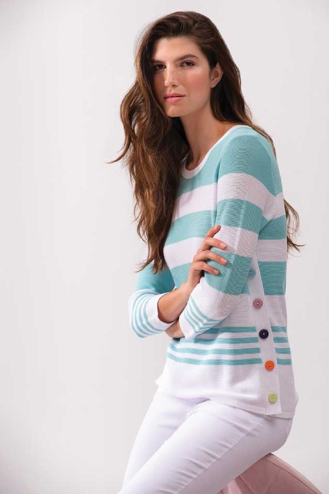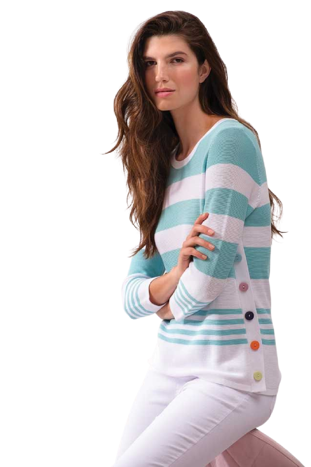 Sky Striped Sweater With Whimsical Colorful Buttons