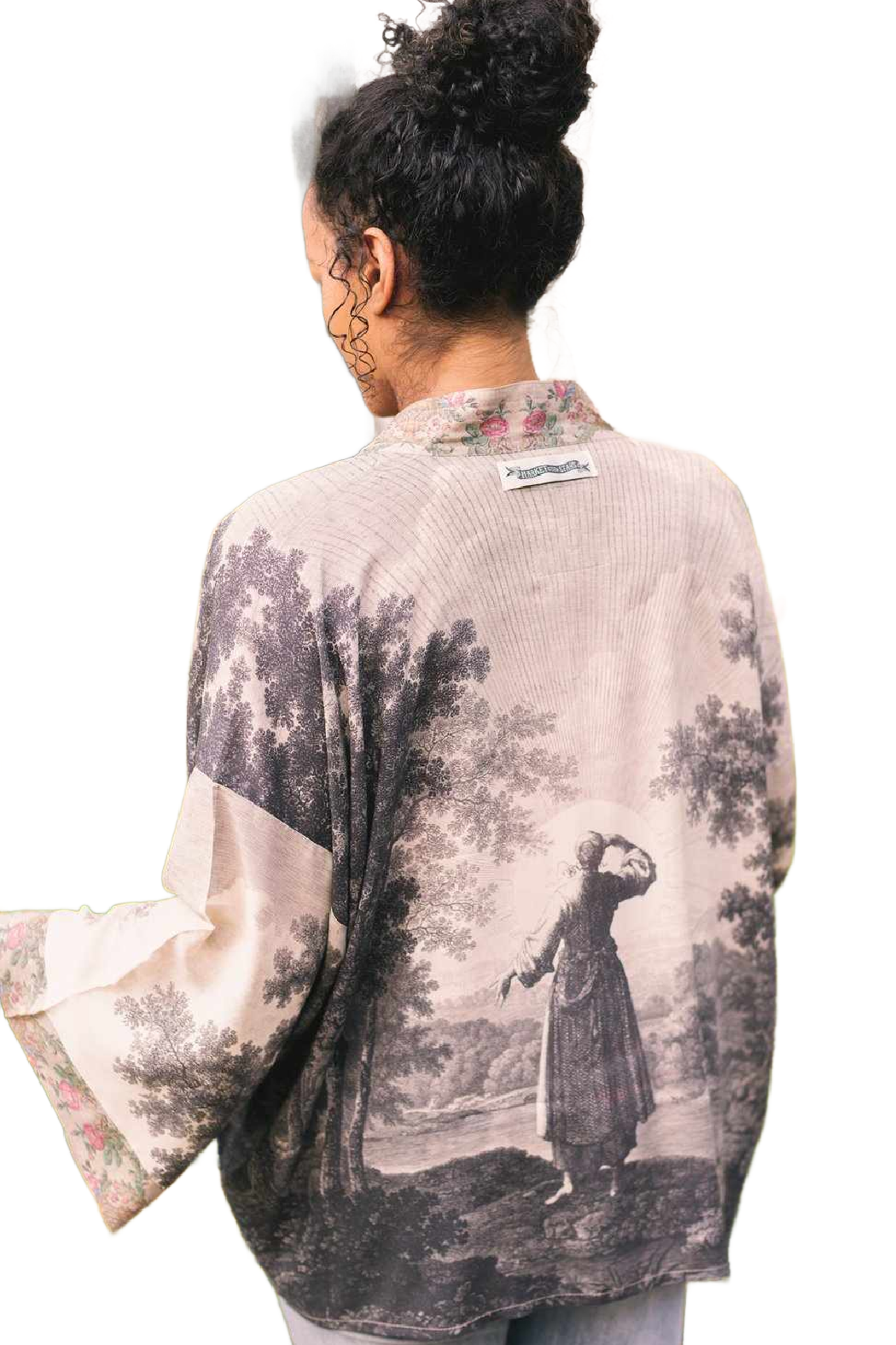 Dreamy, romantic, and full of hope — Still I Rise was created for those who meet each day with a loving and tenacious heart, come what may. We layered together several historic engravings from the 18th century to make this piece— including English forest landscapes by artist William Woolett— and married them with the captivating image of a woman boldly greeting the sun. There’s something so strong in her posture, and we love that she’s stepping forward to meet the day in her bare feet with joy! The trim comes from an intricate watercolour-and-ink drawing of an American heritage quilt from the 1930’s, which pairs beautifully with the charcoal and beige backdrop.