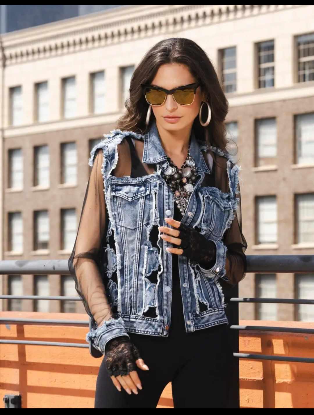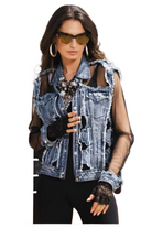 This edgy and stylish women’s denim jacket perfectly blends individuality with modern design. Featuring a standout distressed denim front for a rugged yet chic aesthetic, the jacket is enhanced with sheer mesh sleeves and back panels that bring a feminine and sophisticated touch. The contrast of textures makes it a versatile statement piece for casual or semi-formal wear. Key features: - *Distressed Denim*: Intricate rips and frayed details add a bold and contemporary vibe. - *Sheer Mesh Panels*: Lightweight and breathable fabric creates an eye-catching contrast with the denim, adding elegance and comfort. - *Classic Button-Up Design*: Provides functionality with a timeless appeal. - *Multi-Season Wearability*: Suitable for layering in cooler months or as a light cover-up in spring and summer. This jacket is ideal for anyone looking to elevate their wardrobe with a bold and stylish layer, making it a must-have for trendsetters and fashion-forward individuals. Pair it with leggings, skinny jeans, or skirts for a variety of looks!