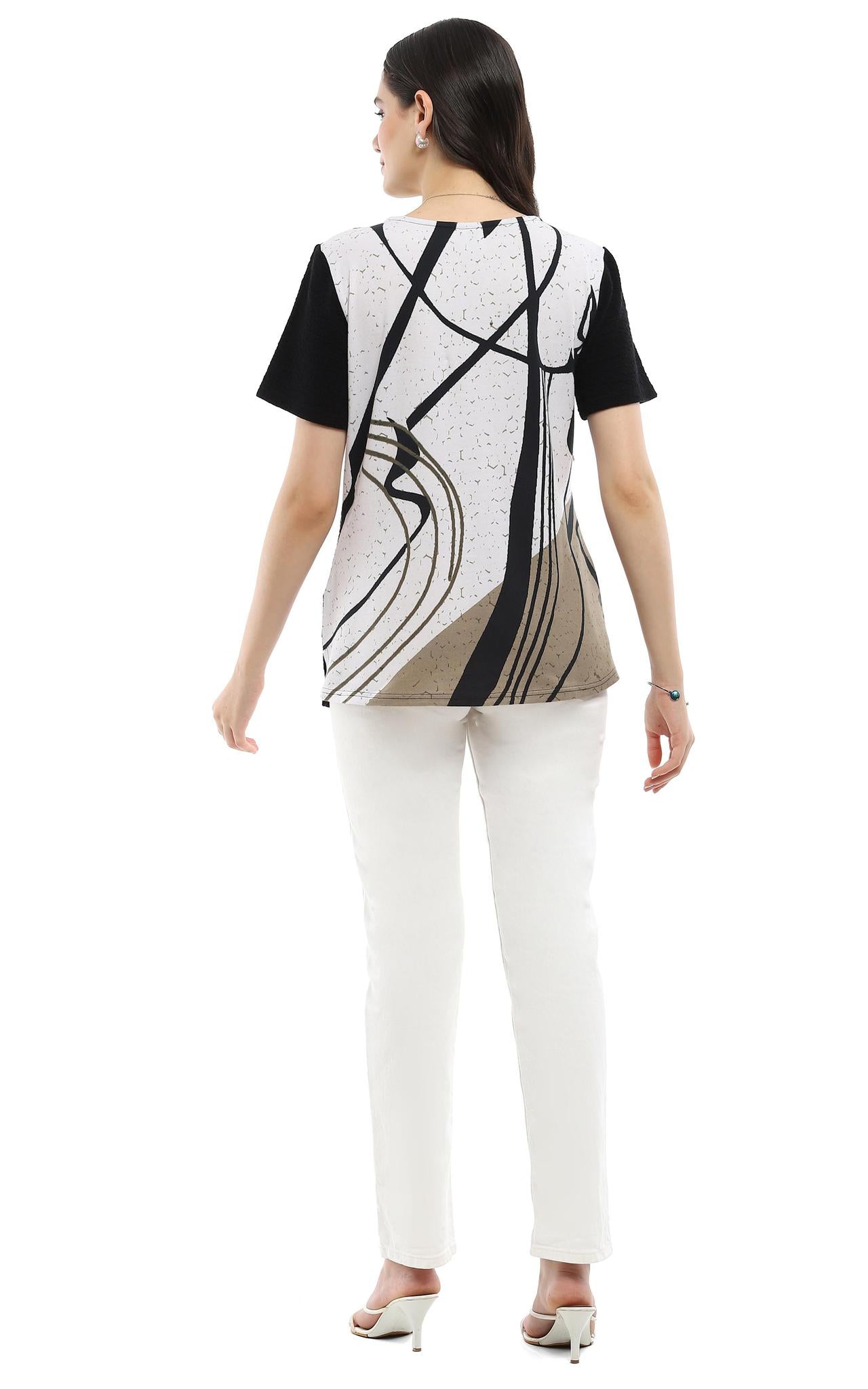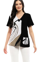 Parsley & Sage will elevate your everyday wardrobe with this chic and modern women’s short-sleeve top. Designed with a striking asymmetrical color block pattern, this top features a dynamic mix of black, white, and beige tones, accented by abstract line details for a unique artistic touch. The V-neckline is adorned with an oversized decorative button, adding a stylish focal point. A functional patch pocket on the front further enhances its contemporary appeal while providing convenient storage for small essentials. Crafted from soft, breathable fabric, this top offers all-day comfort, making it perfect for casual outings or effortless office style. Pair it easily with jeans, trousers, or skirts for a versatile and fashionable look.