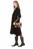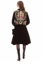 Introducing our luxurious Black French Terry Coat, a sophisticated choice for the modern woman. Featuring a stunning contrast design, this coat effortlessly merges classic elegance with contemporary flair. The back showcases an exquisite, intricately embroidered panel with vibrant floral motifs in shades of pink, gold, and cream, making this piece a standout in any wardrobe. Crafted from premium quality fabric, this coat offers a flattering fit and unparalleled comfort. The full-length sleeves and knee-length hem ensure warmth and style, while the tailored silhouette provides a figure-enhancing look. Perfect for both casual outings and formal events, the Black Dress Coat is versatile enough to elevate any ensemble. Its impeccable craftsmanship and unique design details highlight the coat's superior quality, making it a must-have addition to your seasonal collection. Embrace the blend of tradition and modernity with this remarkable piece that promises to turn heads and garner compliments wherever you go. Add this timeless Black Dress Coat to your wardrobe and experience the perfect harmony of elegance and functionality