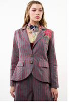 - Stripe button-up blazer with embroidered floral patch on front & back shoulder, contrast velvet elbow patches, 1 crystal button, 2 flap pockets, satin lining