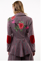 Elevate your wardrobe with this stunning pinstripe blazer, a perfect blend of classic design and modern sophistication. This unique piece features a timeless gray base adorned with elegant red pinstripes, effortlessly combining a professional look with an eye-catching twist. Key Features: - *Bold Floral Embroidery*: Detailed, vibrant floral embroidery on the shoulder and back adds a touch of femininity and artistic flair, making every angle a masterpiece. - *Velvet Elbow Patches*: Rich, red velvet elbow patches not only enhance durability but also infuse the blazer with a touch of luxury and sophistication. - *Tailored Cut*: The blazer's tailored cut and single-breasted closure ensure a flattering silhouette, accentuating your waist and offering a structured yet comfortable fit. - *Functional Pockets*: Equipped with functional pockets, this piece combines style with practicality, providing sufficient space for small essentials. - *Versatile Styling*: Ideal for both formal and casual occasions, pair it with matching pinstripe trousers for a chic, coordinated look or with jeans for a more relaxed, modern outfit. Meticulously designed, this blazer is a testament to exceptional craftsmanship and exquisite detail, promising to be a standout piece in any wardrobe.