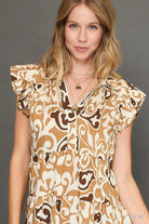 This stylish and breezy floral-print mini dress is a must-have for effortless, everyday elegance. Featuring a relaxed, flowy silhouette with tiered layers, it offers a flattering and comfortable fit. The lightweight fabric ensures breathability, making it perfect for warm-weather outings. Designed with delicate ruffled cap sleeves and a chic V-neckline with a subtle tie detail, this dress blends feminine charm with casual sophistication. The bold floral pattern in neutral tones enhances its versatility, allowing easy pairing with sandals or flats for a laid-back look. Ideal for casual gatherings, vacations, or weekend wear, this dress is a standout addition to any wardrobe.