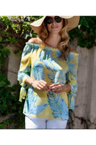 Sunshine Yellow Blouse with Turquoise Leaves...Can be Worn On or Off The Shoulder