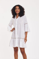Key Features: Lightweight cotton eyelet fabric for breathability Unlined for versatile styling options Flowy silhouette with a tiered hemline 3/4 length bell sleeves with lace insert accents Button-down front for adjustable coverage Perfect as a casual day dress, beach cover-up, or resort wear
