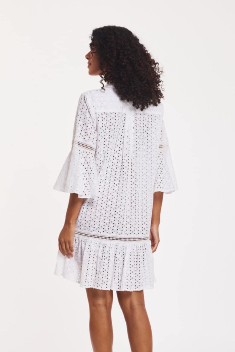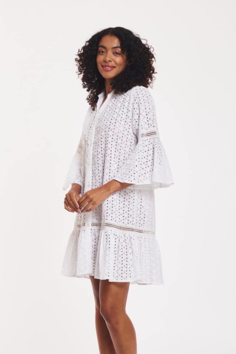 Keywords: white eyelet dress, unlined eyelet dress, Moda Posa dress, summer tunic dress, resort wear, beach cover-up dress, women’s button-down dress, breezy cotton dress