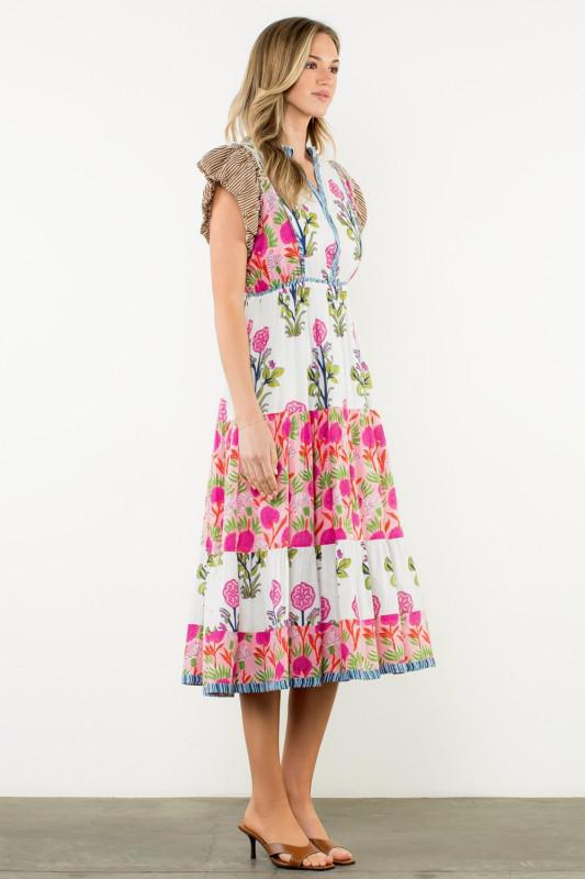 Turn heads this season in our Vibrant THML Floral Tiered Midi Dress, the perfect blend of playful charm and resort chic style for your next getaway or garden party. This stunning dress features a colorful hand-block-inspired floral print with bold shades of pink, coral, and green on a crisp white backdrop. The tiered silhouette creates beautiful movement with every step, while the unique puff sleeves with contrasting brown and white stripes add an unexpected touch of bohemian flair. Designed with a flattering split neckline and a relaxed, flowy fit, this dress is effortlessly elegant yet comfortable for all-day wear. Pair it with sandals for a casual daytime look or dress it up with wedges and statement earrings for an evening out. Fully lined
