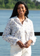 Alison Sheri will Elevate your wardrobe with this feminine and breezy eyelet blouse, perfect for spring and summer style. Crafted with delicate floral print and airy eyelet detailing, this long sleeve blouse features a soft white base accented with subtle lavender and blue blossoms. The lightweight fabric and relaxed fit offer breathable comfort, while the button-front design and crisp collar add a touch of classic polish. Whether you’re heading to brunch, a weekend getaway, or a casual day at the office, this blouse pairs effortlessly with denim, trousers, or skirts for a fresh, put-together look.