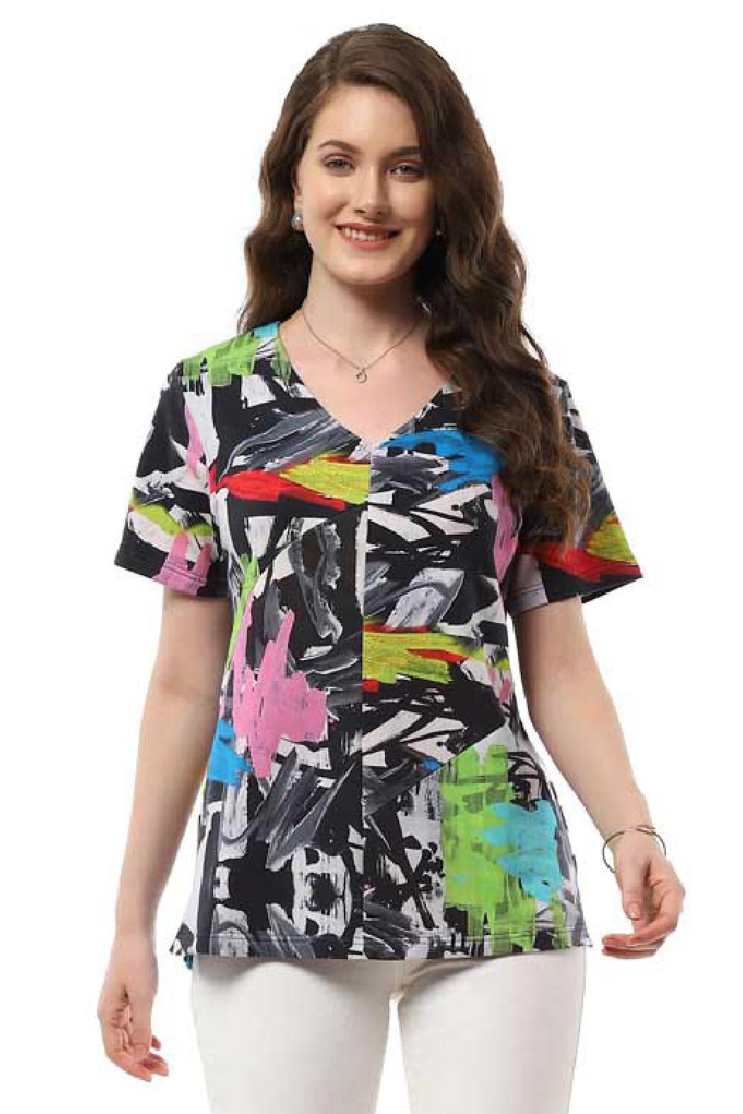 Add a touch of artistic flair to your wardrobe with this vibrant, abstract-print women's top. Featuring a bold, multicolor brushstroke design on a black base, this top is perfect for making a statement. The soft, breathable fabric ensures all-day comfort, while the relaxed fit provides effortless wearability. A flattering V-neckline and short sleeves make it ideal for casual outings, workwear, or everyday fashion. Pair it with jeans, trousers, or skirts for a trendy, versatile look that stands out in any setting.
