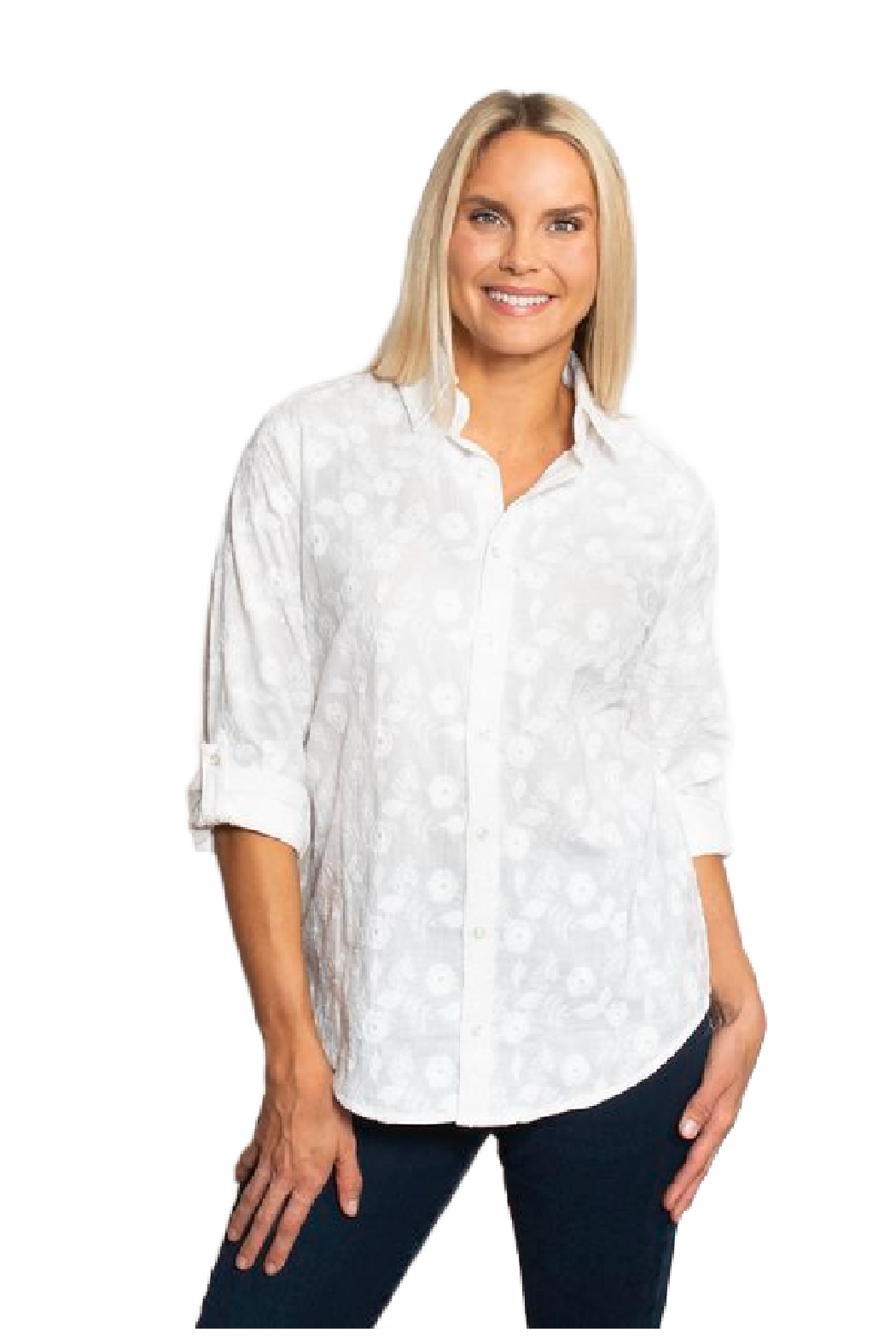 This elegant white button-up blouse is a versatile wardrobe essential, ideal for both casual and formal occasions. Crafted from lightweight, breathable Cotton fabric, it features an all-over floral pattern that adds a touch of femininity and sophistication to the design. The relaxed fit ensures comfort, while the classic collar and button-down front give it a polished appearance. The adjustable roll-tab sleeves allow for versatile styling, making it perfect for year-round wear. Pair it with jeans for a casual look or trousers and accessories for a chic, professional ensemble. Designed for comfort and style, this blouse is a timeless addition to any wardrobe.