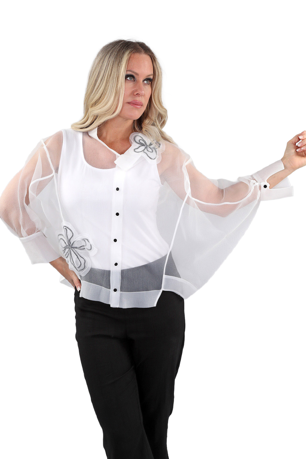 Elevate your wardrobe with this exquisite sheer organza blouse, a sophisticated blend of modern elegance and feminine charm. Featuring voluminous bat wig balloon sleeves crafted from lightweight, translucent fabric, this blouse creates an effortlessly graceful silhouette. The structured cuffs and button-down front add a polished touch, while delicate charcoal floral appliqués provide an artistic contrast against the crisp white fabric. A layered look enhances versatility, making it perfect for both formal and chic casual occasions. Ideal for those who seek a statement piece with a refined, fashion-forward appeal.