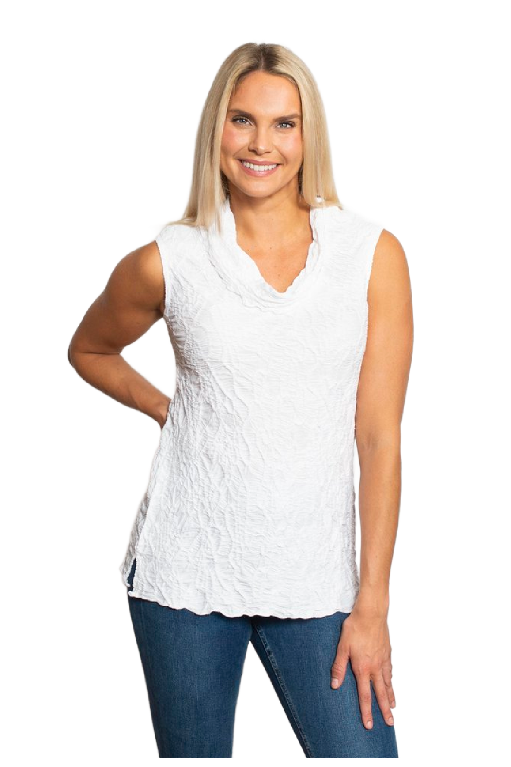 This sleeveless white top is a perfect blend of comfort and elegance, designed to elevate your casual wardrobe. Crafted with lightweight, crinkled fabric, it offers a chic textured look while being exceptionally breathable. The subtle cowl neckline adds a sophisticated touch, making it versatile for both casual outings and more polished occasions. Its relaxed fit flatters all body types and ensures all-day comfort. Finished with a slightly flared hemline and side slits for easy movement, this top is a must-have for versatile, effortless style. Pair it with jeans or skirts for a timeless, put-together look