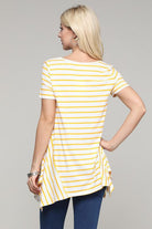 Yellow and White Striped Asymmetrical Hem Tunic Top – Casual Women's Summer Fashion Add a pop of sunshine to your wardrobe with this yellow and white striped tunic top, designed for effortless style and comfort. Made from soft, breathable knit fabric, this women’s short sleeve tunic features a relaxed fit, classic crew neckline, and a flattering asymmetrical hemline that adds movement and flair to your outfit. Perfect for casual days out or relaxed weekend wear, this lightweight striped top pairs beautifully with jeans, leggings, or capris. Whether you're running errands or meeting friends, this flowy tunic top for women delivers laid-back charm with a fashion-forward twist.